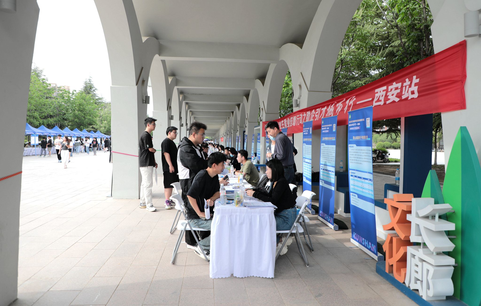 活動(dòng)中,錢許東一行實(shí)地走訪昆山市企業(yè)展位,詳細(xì)了解企業(yè)招聘需求和崗位設(shè)置情況。昆山市政府工作人員現(xiàn)場(chǎng)推介人才引進(jìn)政策,為畢業(yè)生解答落戶補(bǔ)貼、就業(yè)支持等具體問(wèn)題。西安高新區(qū)黨工委人才辦副主任魏向博(化工博12校友)與科技創(chuàng)新局負(fù)責(zé)人李斌強(qiáng)組織區(qū)內(nèi)10家重點(diǎn)企業(yè),與學(xué)校科技處、學(xué)生就業(yè)指導(dǎo)中心及相關(guān)學(xué)院圍繞科研成果轉(zhuǎn)化、校企協(xié)同引才等進(jìn)行對(duì)接。未央?yún)^(qū)人力資源和社會(huì)保障局副局長(zhǎng)李洪波介紹了本地政府支持高校畢業(yè)生就業(yè)的專項(xiàng)政策,助力畢業(yè)生留陜發(fā)展。