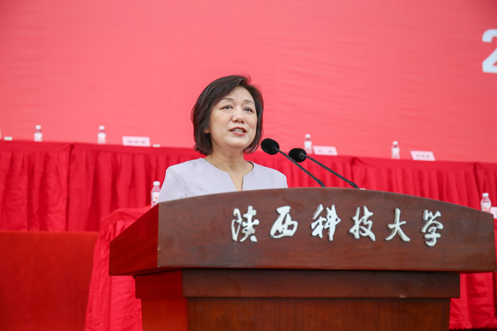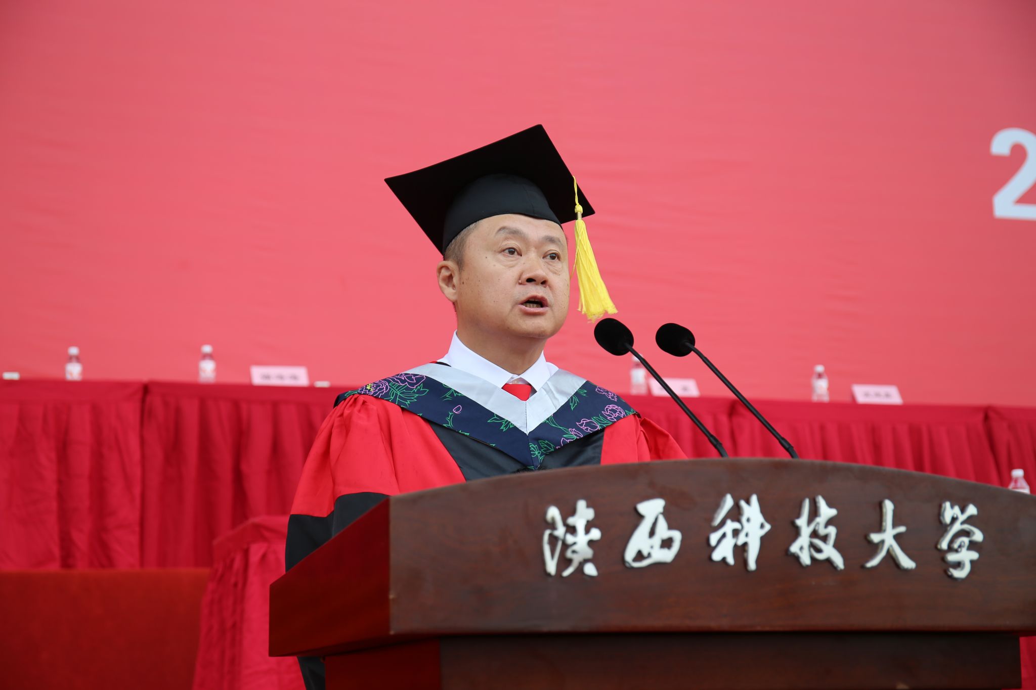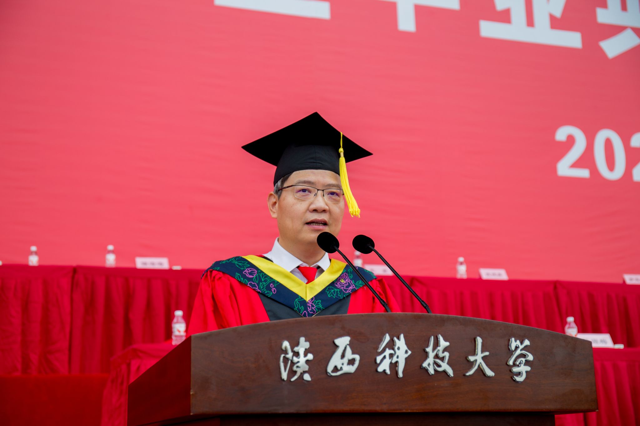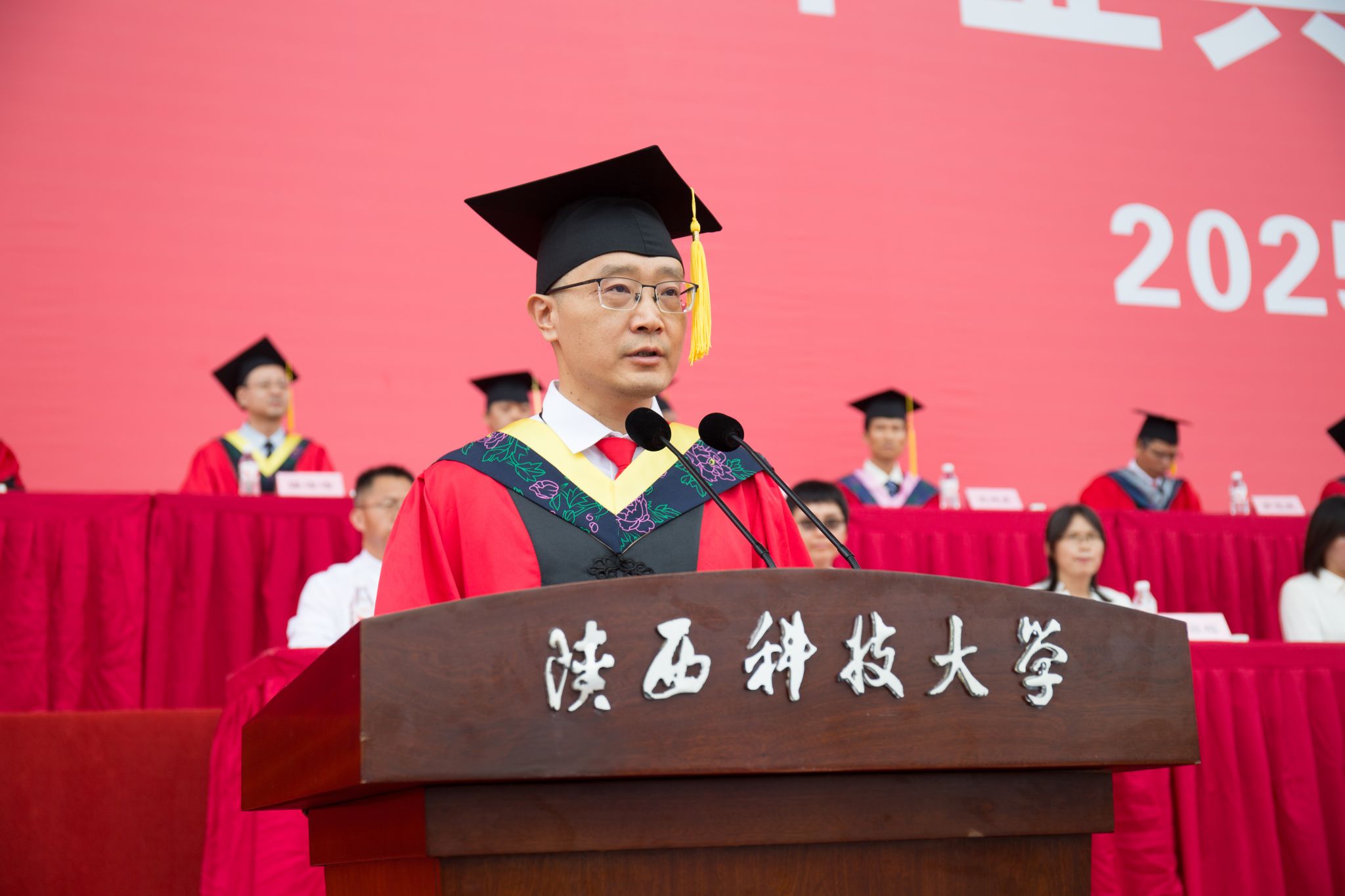 黃劍鋒為畢業(yè)生送上深情寄語(yǔ)和真摯祝福。他代表學(xué)校向全體畢業(yè)生圓滿(mǎn)完成學(xué)業(yè)表示熱烈祝賀,向辛勤付出的全體教職員工和學(xué)生家長(zhǎng)表示衷心感謝,并表示2025屆畢業(yè)生信仰堅(jiān)定、勤學(xué)善思、勇于實(shí)踐、心懷家國(guó),共同見(jiàn)證、參與和貢獻(xiàn)了學(xué)校近年來(lái)取得的日新月異的變化,以實(shí)際行動(dòng)為“至誠(chéng)至博”校訓(xùn)和“三創(chuàng)兩遷”大學(xué)精神譜寫(xiě)了青春華章。面對(duì)大學(xué)生活里一些未能圓滿(mǎn)的“小遺憾”,他叮囑同學(xué)們將這些“小遺憾”視作歲月留給未來(lái)的伏筆和砥礪前行的動(dòng)力,向著更遼闊的星辰大海揚(yáng)帆起航!