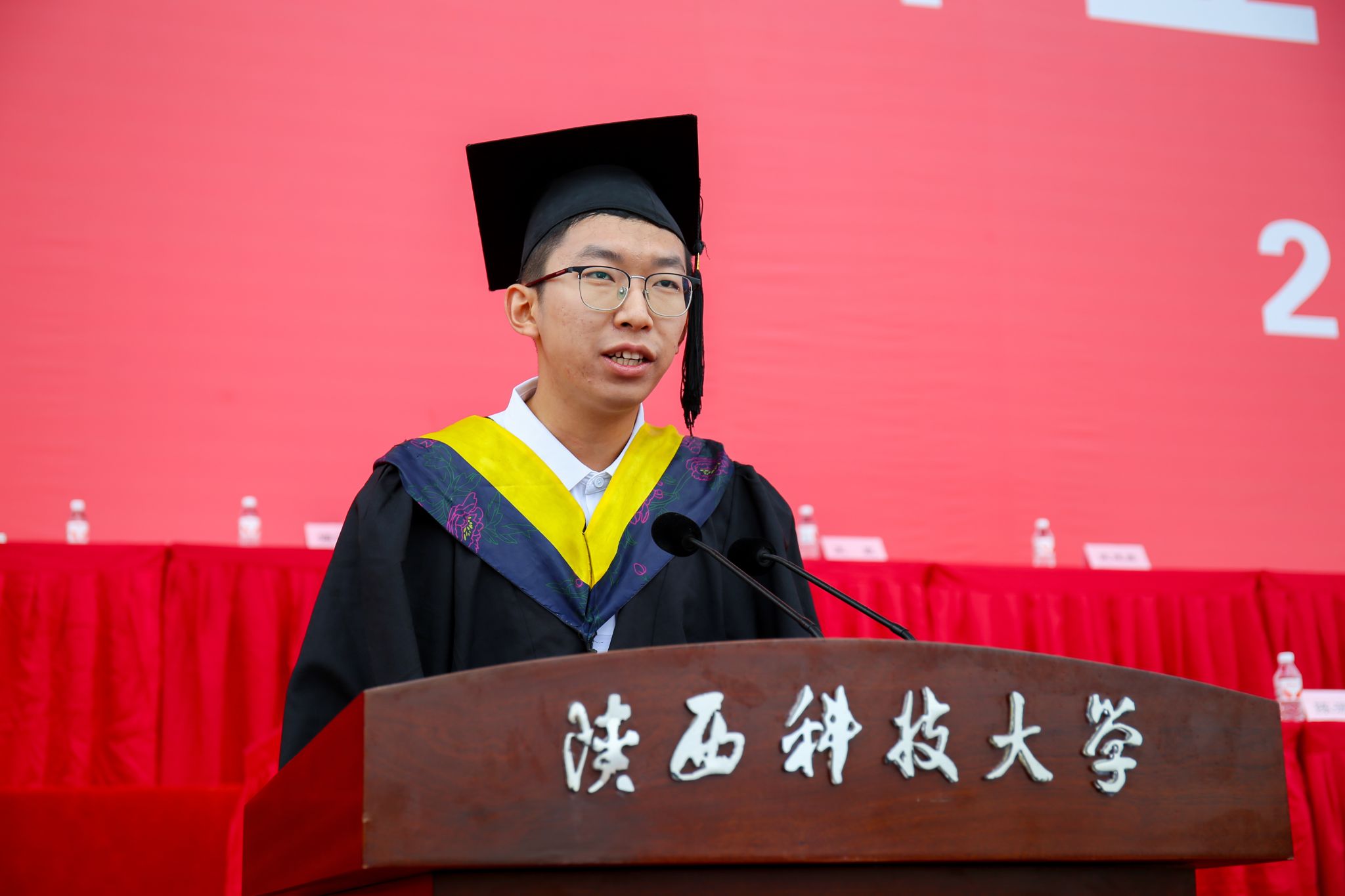 畢業(yè)生代表、材料科學(xué)與工程學(xué)院2025屆本科畢業(yè)生王際倫分享了自己和學(xué)校共同成長(zhǎng)的點(diǎn)滴記憶,表達(dá)了對(duì)母校和師長(zhǎng)的感恩之情,表示2025屆畢業(yè)生會(huì)始終謹(jǐn)記“三創(chuàng)兩遷”大學(xué)精神,帶著母校的期望,以實(shí)干擔(dān)當(dāng)在時(shí)代的浪潮中綻放青春光芒。