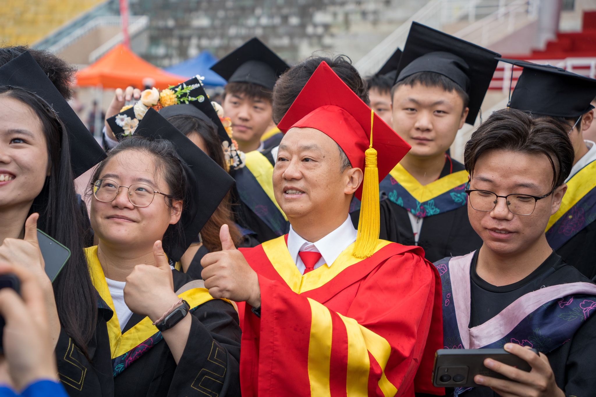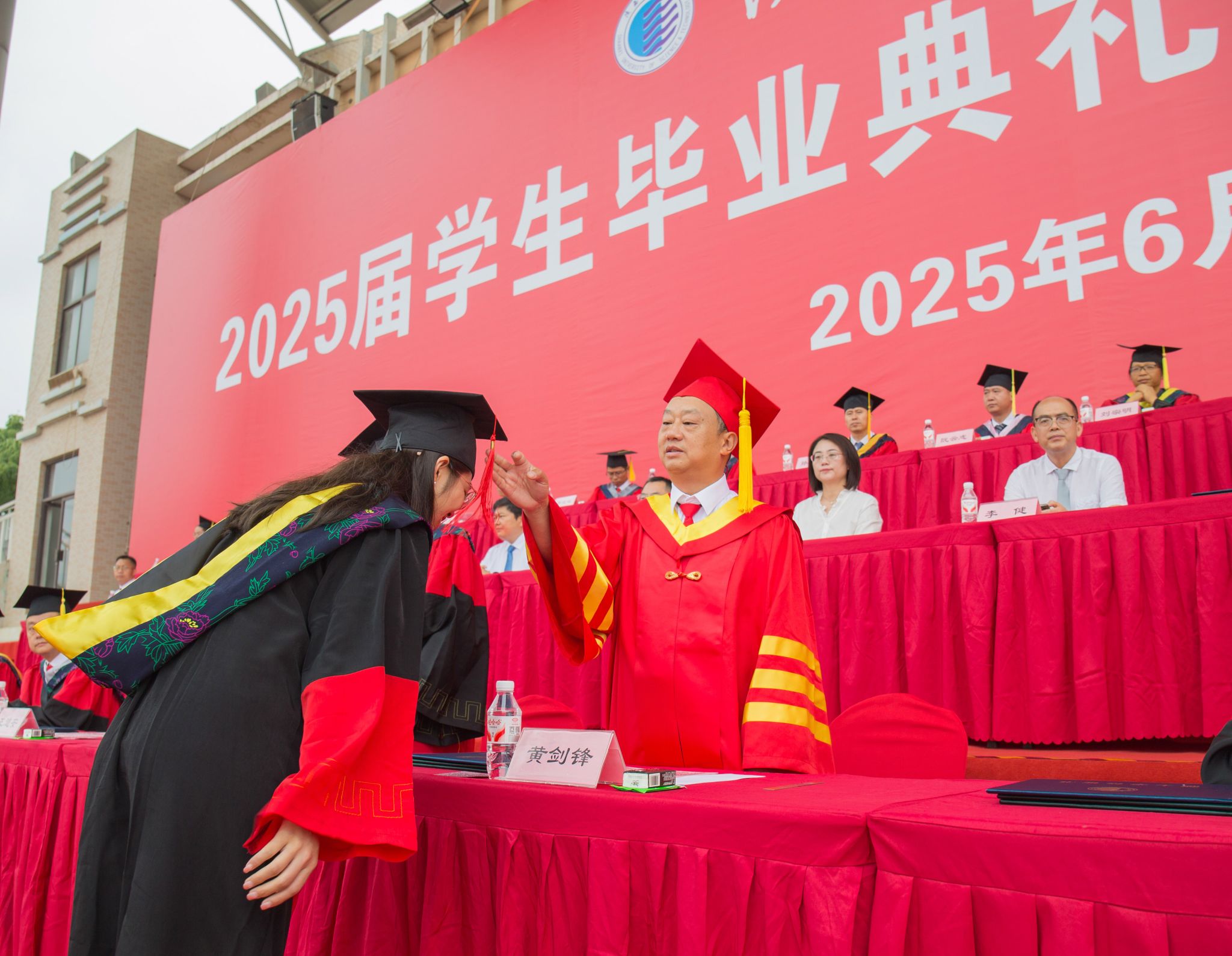 在畢業(yè)生即將開(kāi)啟新征程的重要時(shí)刻,黃劍鋒對(duì)2025屆全體畢業(yè)生提出三點(diǎn)期許:一是永葆家國(guó)情懷,在復(fù)興偉業(yè)中錨定青春航向。希望同學(xué)們聽(tīng)黨話(huà)、跟黨走、立大志,奮斗在科技攻關(guān)的前沿陣地、在鄉(xiāng)村振興的廣闊田野、在基層治理的一線(xiàn)崗位,學(xué)好必修課,練好基本功,服務(wù)“國(guó)之大者”。二是勤于修身律己,在品格涵養(yǎng)中筑牢人生根基。希望同學(xué)們立德修身、正心明志,嚴(yán)于律己、慎獨(dú)慎微,堅(jiān)持鍛煉、強(qiáng)健體魄,塑造正直誠(chéng)信、堅(jiān)韌不拔、寬容仁厚的品格,做自己人生的主人公。三是堅(jiān)持守正創(chuàng)新,在變革浪潮中錘煉過(guò)硬本領(lǐng)。希望同學(xué)們永葆求知熱忱,矢志創(chuàng)新發(fā)展,將終身學(xué)習(xí)視為一種習(xí)慣和核心競(jìng)爭(zhēng)力,以“敢為天下先”的氣魄在前沿科技、未來(lái)領(lǐng)域探索未知,以“逢山開(kāi)路,遇水架橋”的決心在時(shí)代變革中乘風(fēng)破浪。