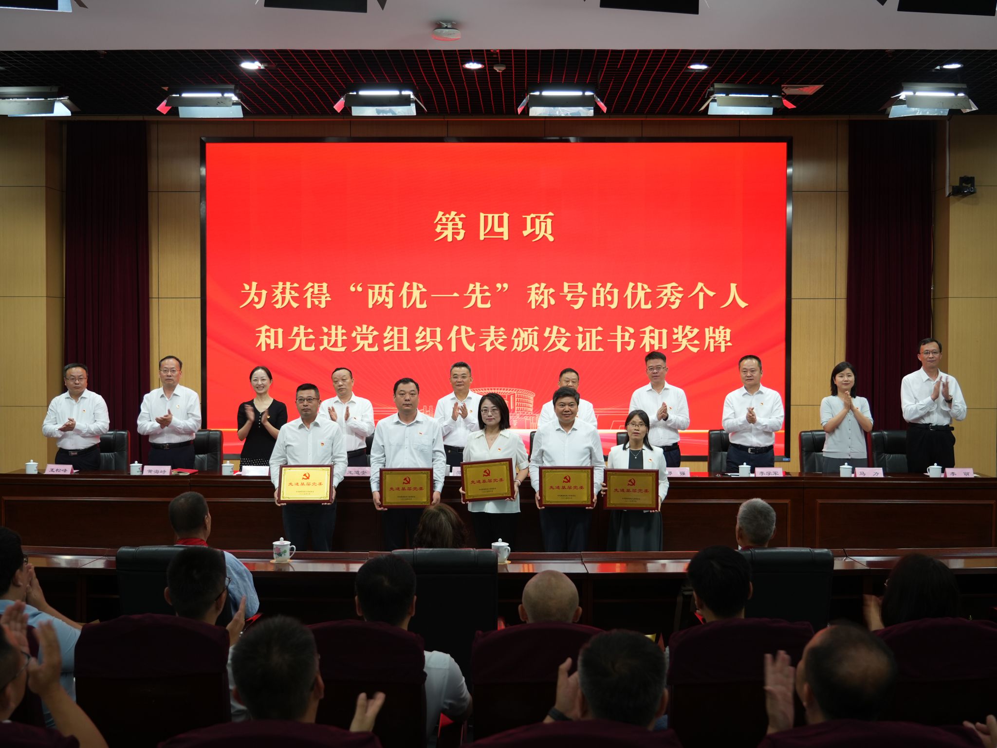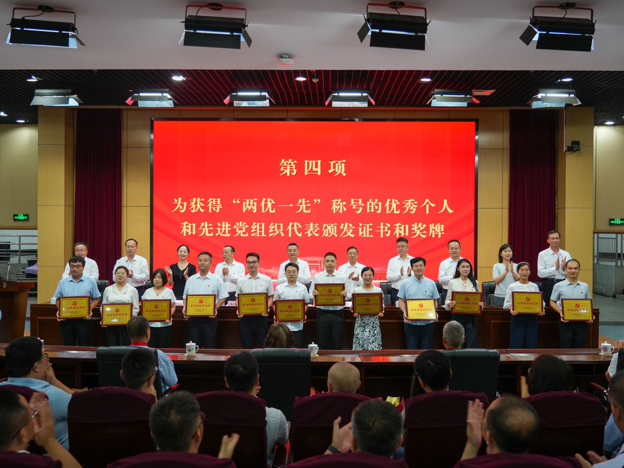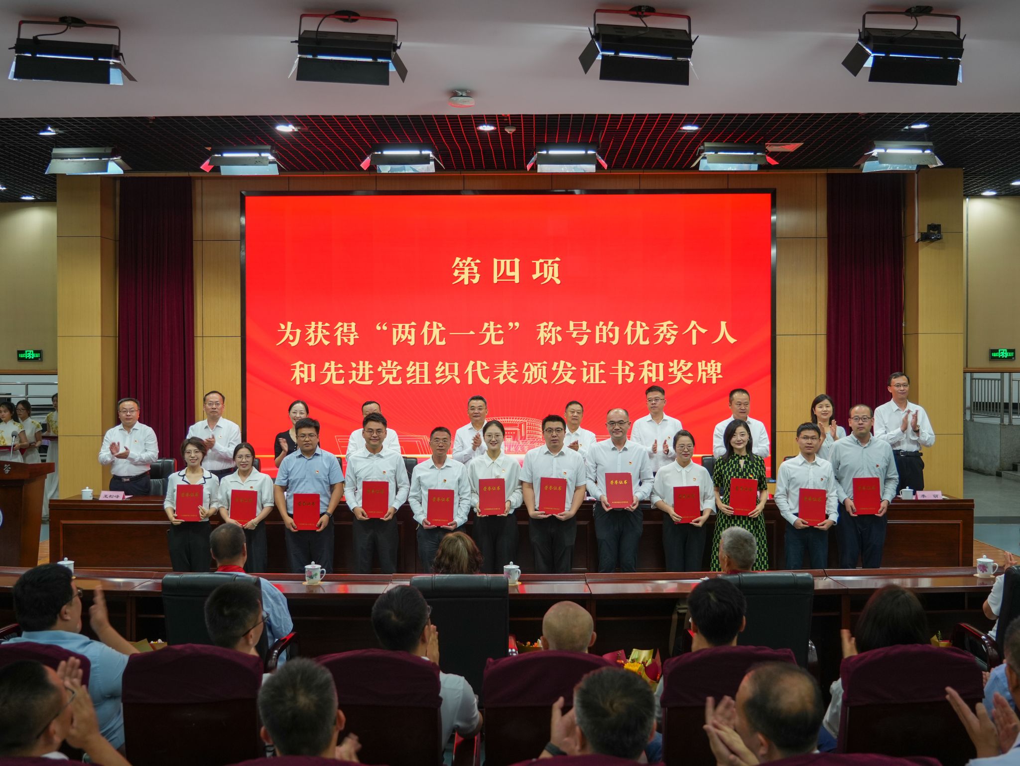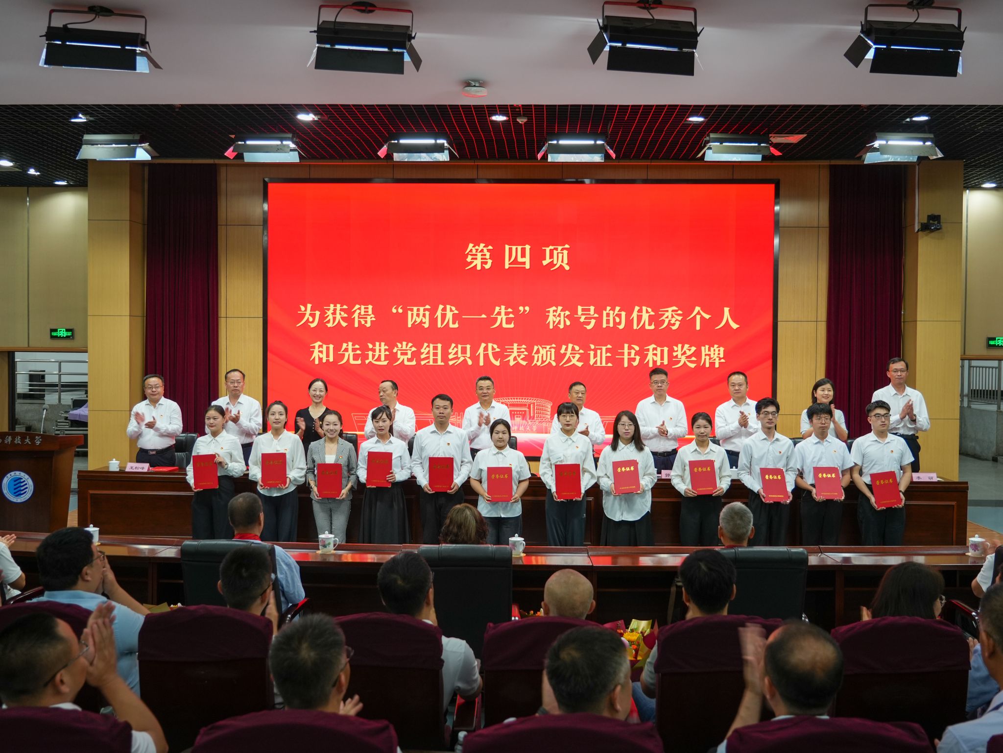 大會在莊嚴的國歌聲中拉開帷幕。黨委副書記王道安宣讀“光榮在黨50年”紀念章人員名單和“兩優(yōu)一先”表彰決定。樊建武、黃劍鋒為“光榮在黨50年”黨員代表頒發(fā)紀念章,受表彰的“兩優(yōu)一先”代表依次上臺領取了證書和獎牌。