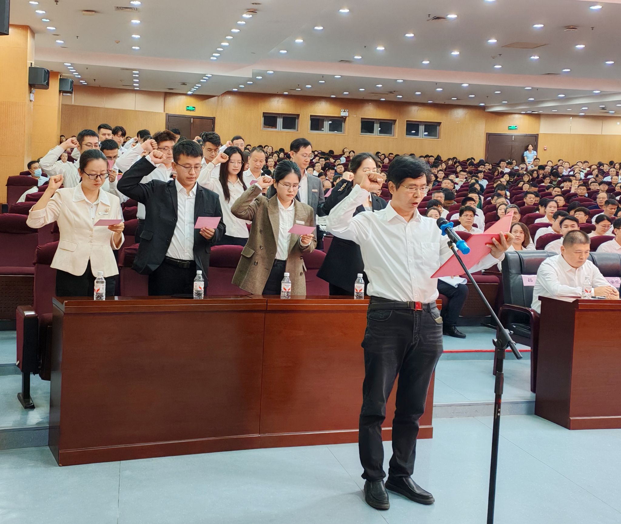 在陜西省青年突擊手、陜西省師德先進(jìn)個(gè)人、數(shù)學(xué)與數(shù)據(jù)科學(xué)學(xué)院教授白云霄的領(lǐng)誓下,在場全體新入職教師莊嚴(yán)宣誓。