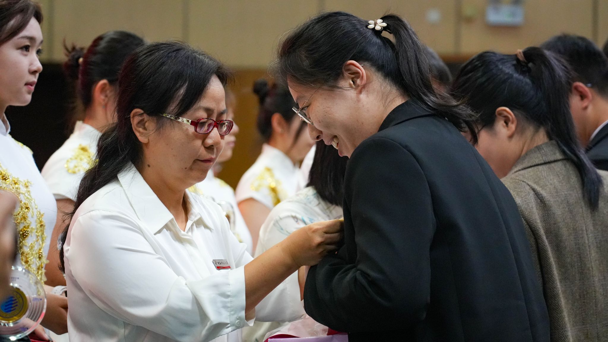 新進(jìn)教師代表為從教滿三十年教師代表送上鮮花祝福,從教滿三十年教師代表為新進(jìn)教師代表佩戴校徽。