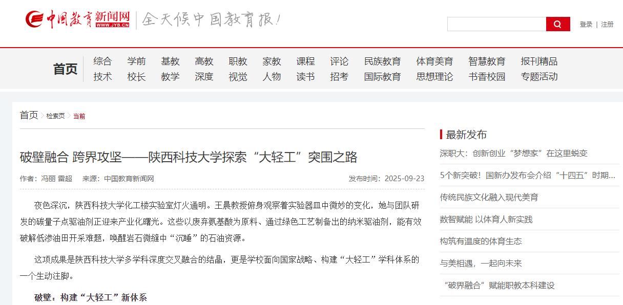 9月23日,中國教育新聞網(wǎng)報道陜西科技大學(xué)探索“大輕工”突圍之路:破壁融合 跨界攻堅。