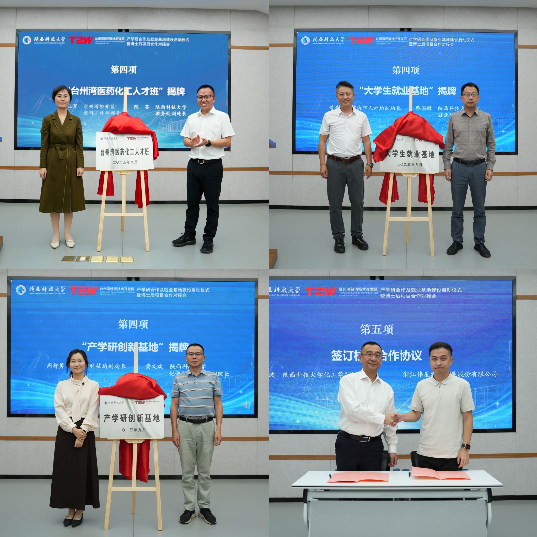 儀式現(xiàn)場(chǎng),學(xué)校與臺(tái)州灣經(jīng)開區(qū)共同為“臺(tái)州灣醫(yī)藥化工人才班”“大學(xué)生就業(yè)基地”“產(chǎn)學(xué)研創(chuàng)新基地”揭牌,化工學(xué)院院長(zhǎng)仝建波代表學(xué)院與永太科技、本立科技、偉星實(shí)業(yè)等上市企業(yè)代表簽校企合作協(xié)議。儀式后,相關(guān)領(lǐng)導(dǎo)、企業(yè)負(fù)責(zé)人及教師代表進(jìn)行了博士后項(xiàng)目合作對(duì)接。同時(shí)臺(tái)州灣25家優(yōu)秀企業(yè)在校舉辦了專場(chǎng)招聘會(huì)。