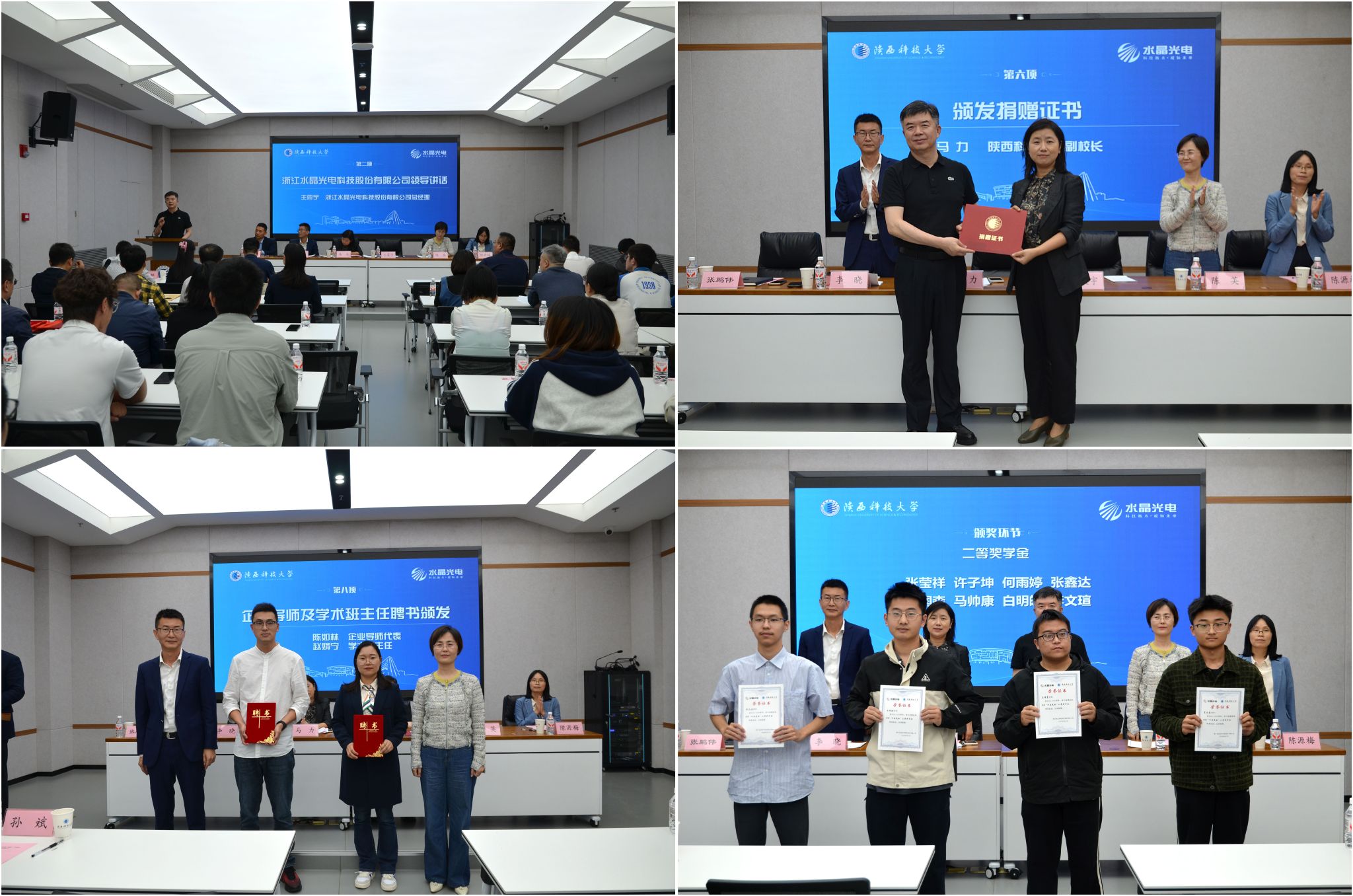 9月26日,陜西科技大學(xué)物理學(xué)院隆重舉行“水晶光電”獎(jiǎng)學(xué)金頒獎(jiǎng)暨產(chǎn)教融合“水晶班”開班及儀器捐贈(zèng)儀式。副校長馬力、水晶光電總經(jīng)理王震宇出席活動(dòng),校企雙方相關(guān)部門負(fù)責(zé)人、物理學(xué)院班子成員、獲獎(jiǎng)學(xué)生、“水晶班”全體學(xué)生及師生代表共110余人參加。儀式由物理學(xué)院院長張鵬偉主持。