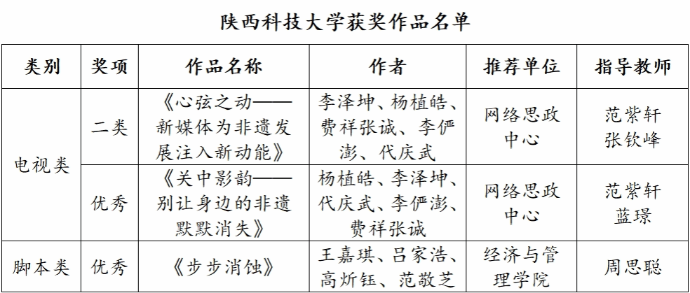 《心弦之動——新媒體為非遺發(fā)展注入新動能》獲電視類優(yōu)秀作品(高校通道)二類獎項。作品聚焦新媒體時代背景下非物質文化遺產的傳承與推廣,展現(xiàn)了現(xiàn)代傳播技術為非遺技藝搭建與公眾溝通橋梁的創(chuàng)新實踐。《關中影韻——別讓身邊的非遺默默消失》獲該賽道優(yōu)秀獎,作品通過富有感染力的鏡頭語言,展現(xiàn)了陜西皮影戲等非遺項目的獨特魅力,呼吁社會關注瀕臨失傳的文化瑰寶。作品《步步消蝕》獲腳本類優(yōu)秀作品(高校通道)優(yōu)秀獎。該作品通過精巧的構思和深刻的內涵,揭示了毒品對青少年身心健康的嚴重危害,有力地升華了珍愛生命、遠離毒品的警示主題。