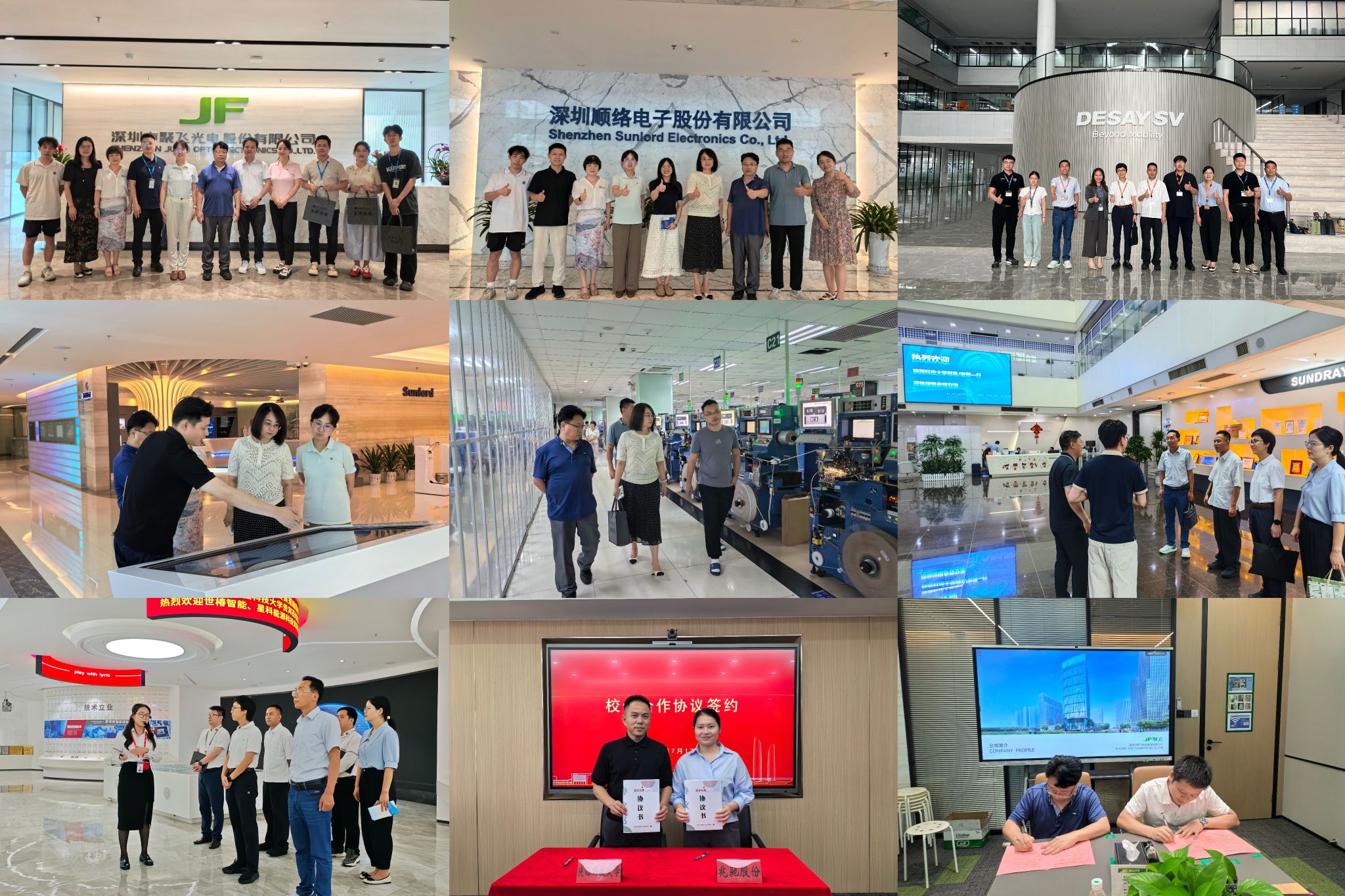 在拓展校企合作與產(chǎn)業(yè)調(diào)研方面,團(tuán)隊圍繞新型顯示技術(shù)、集成電路、半導(dǎo)體、汽車電子等領(lǐng)域,實(shí)地考察了包括深圳市兆馳股份有限公司、深圳和美精藝半導(dǎo)體科技股份有限公司、勝科納米(深圳)有限公司、深圳順絡(luò)電子股份有限公司、深圳聚飛光電股份有限公司、德賽西威汽車電子股份有限公司、廣東利元亨智能裝備股份有限公司、信銳網(wǎng)科技術(shù)有限公司、中南國際科技發(fā)展(深圳)有限公司、深圳市圖興科技有限公司等16家企業(yè)。通過參觀企業(yè)展廳、生產(chǎn)線,聽取企業(yè)介紹,團(tuán)隊深入了解了行業(yè)發(fā)展趨勢、技術(shù)前沿動態(tài)及具體崗位能力需求。校企雙方圍繞提升人才培養(yǎng)精準(zhǔn)度,就課程體系優(yōu)化、實(shí)踐教學(xué)強(qiáng)化、實(shí)習(xí)就業(yè)基地共建、定向崗位開拓等議題展開了務(wù)實(shí)討論,旨在將產(chǎn)業(yè)需求融入培養(yǎng)方案,提升學(xué)生就業(yè)競爭力。