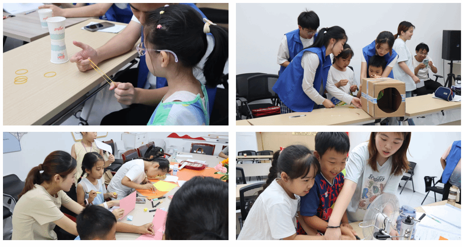 “做中學(xué)”環(huán)節(jié),實(shí)踐團(tuán)將科學(xué)知識融入趣味實(shí)驗(yàn),如“空氣炮”“紙杯飛機(jī)”“走馬燈”等,吸引孩子們注意力,講解科學(xué)原理,讓科學(xué)變得生動。同時開設(shè)英語、閱讀、手工等課程,助力孩子全面發(fā)展。