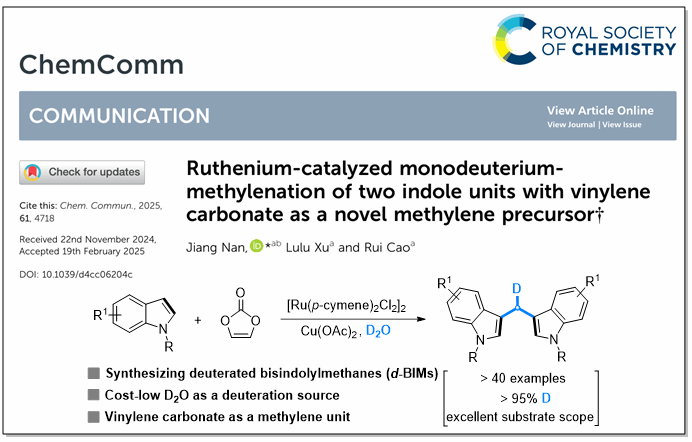 碳酸亞乙烯酯(VC)作為C2、C3合成子已得到廣泛而深入的研究,但作為C1合成子偶聯(lián)片段的開發(fā)與應(yīng)用卻相對(duì)匱乏。南江團(tuán)隊(duì)近期成功開發(fā)了一種釕催化吲哚類化合物與碳酸乙烯酯(VC)的單氘甲基化偶聯(lián)反應(yīng),并以此構(gòu)建結(jié)構(gòu)多樣的氘化雙吲哚甲烷衍生物(d-BIMs)。該方法的顯著優(yōu)勢(shì)體現(xiàn)在:1)創(chuàng)新性采用廉價(jià)易得的VC作為新型氘代亞甲基前體;2)成功實(shí)現(xiàn)藥物分子的后期氘代修飾與功能化。該策略為開發(fā)氘標(biāo)記生物活性分子提供了新思路與新途徑。相關(guān)成果以“Ruthenium-catalyzed monodeuterium-methylenation of two indole units with vinylene carbonate as anovel methylene precursor”為題發(fā)表在自然指數(shù)期刊Chemical Communications上,實(shí)驗(yàn)工作主要由2022級(jí)碩士生徐露露完成。