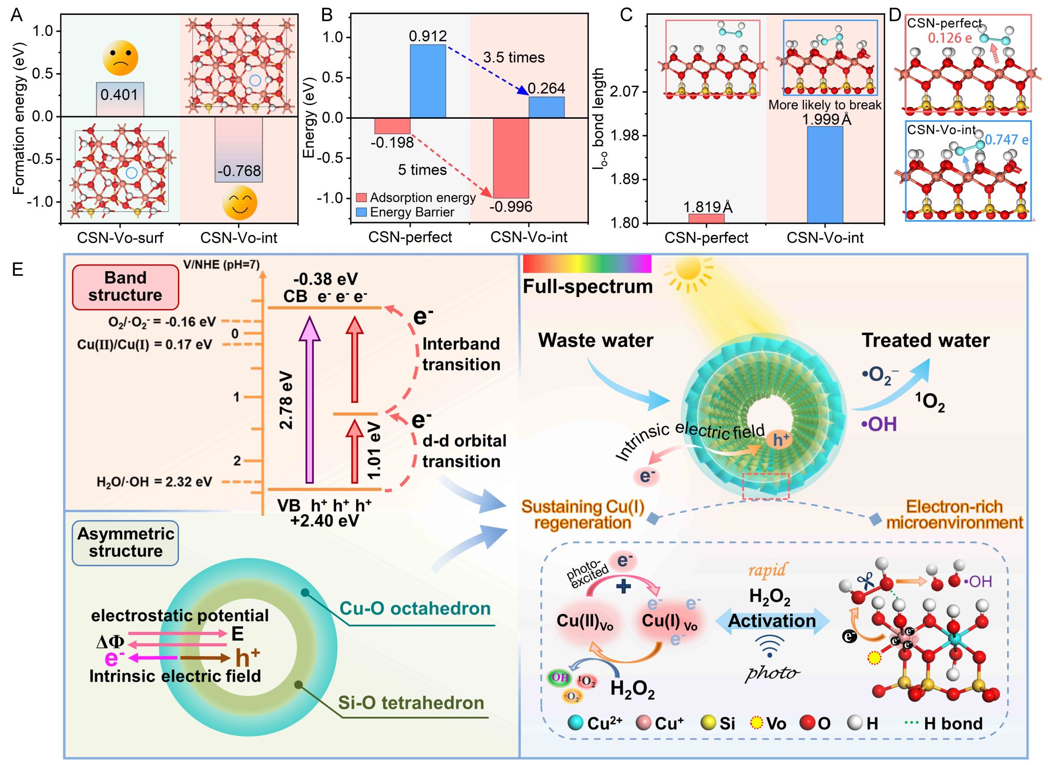 為了克服上述挑戰(zhàn),陜西科技大學(xué)王蘭教授團隊提出了一種非對稱結(jié)構(gòu)設(shè)計策略,構(gòu)建了Janus硅酸銅納米管(CSN)并誘導(dǎo)產(chǎn)生了富電子Cu(Ⅰ)和氧空位缺陷(Vo)位點,實現(xiàn)了有效的全光譜驅(qū)動光芬頓催化。該研究發(fā)現(xiàn),Vo和CuO6八面體結(jié)構(gòu)的共存使得CSN獲得了優(yōu)異的全光譜光響應(yīng)能力;不對稱結(jié)構(gòu)所產(chǎn)生的固有內(nèi)建電場極大地促進(jìn)了光生載流子的空間分離和光生電子的定向轉(zhuǎn)移;Cu(Ⅰ)位點附近的Vo充當(dāng)電子陷阱位點,將光生電子富集到其鄰近的Cu位點,加速了Cu(Ⅱ)/Cu(Ⅰ)的氧化還原循環(huán),這充分利用了光激發(fā)電子“自我補充”來補償Cu(Ⅰ)位點的給電子能力并實現(xiàn)了H2O2的持續(xù)活化。
