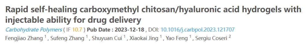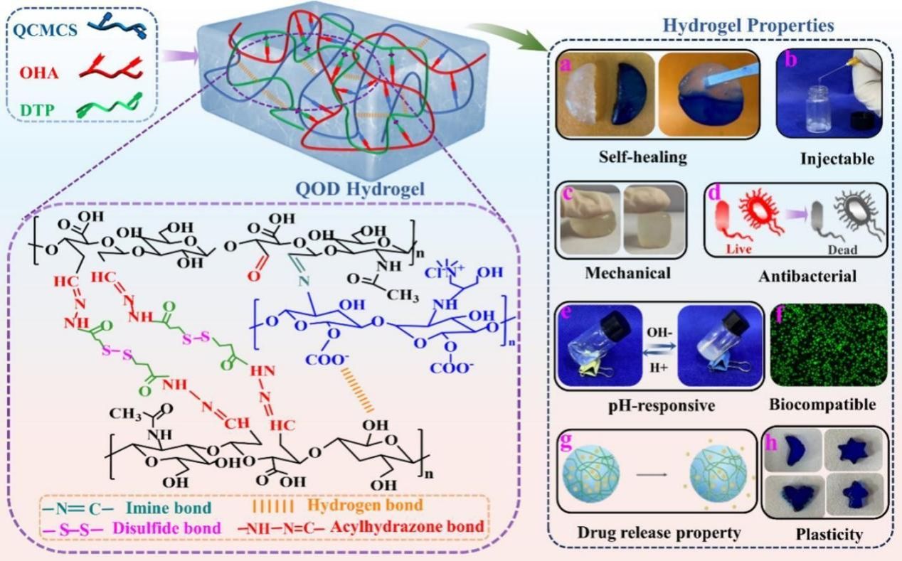 藥物釋放是治療人類各種疾病的有效手段,因此在生物醫(yī)學(xué)領(lǐng)域構(gòu)建合適的藥物釋放載體非常重要。本團隊開發(fā)了一種以季銨化羧甲基殼聚糖(QCMCS)、氧化透明質(zhì)酸(OHA)、3,3′-二硫雙-(丙酰肼)(DTP)為原料合成具有優(yōu)異性能的水凝膠,作為藥物釋放的載體。水凝膠是通過簡單的“一鍋法”制備的,無需外部刺激,基于形成的動態(tài)共價鍵(亞胺鍵、酰腙鍵、二硫鍵)和氫鍵之間的相互作用。水凝膠具有快速自愈特性,30分鐘后自愈率為96%,以及良好的pH反應(yīng)性和出色的細胞相容性(細胞存活率高達98%)。水凝膠的壓應(yīng)力達到423 kPa。此外,一種代表性藥物 (乙酰水楊酸) 在水凝膠中顯示出持續(xù)釋放(>72 h)。動力學(xué)模型顯示藥物釋放行為與Fick擴散機制一致,研究結(jié)果表明QCMCS + OHA + DTP可注射自修復(fù)水凝膠是構(gòu)建pH控制藥物遞送平臺的潛在材料。相關(guān)研究成果以“Rapid self-healing carboxymethyl chitosan/hyaluronic acid hydrogels with injectable ability for drug delivery”為題發(fā)表在國際期刊Carbohydrate Polymers(文章鏈接:https://doi.org/10.1016/j.carbpol.2023.121707)