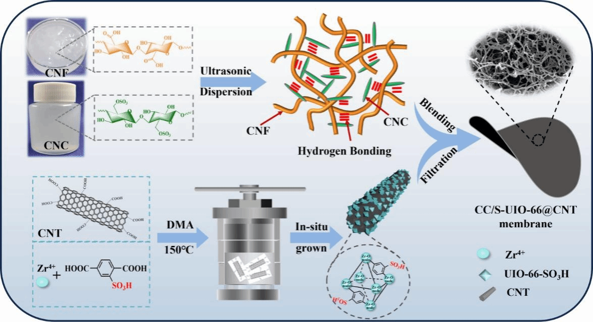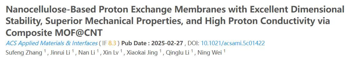 本團隊還通過納米纖維素復(fù)合MOF@CNT,制備了一種可用于燃料電池的質(zhì)子交換膜,以CNFs 和CNCs的復(fù)合材料為基體,然后在CNT表面原位生長 S-UIO-66,然后將其作為填料添加到基體中。值得注意的是,S-UIO-66在CNT表面的原位生長不僅促進了CNTs 的均勻分散,而且有效地保證了S-UIO-66在 CNF/CNC基體中的分布。此外,CNF/CNC基體的高電負性進一步增強了這種色散效應(yīng)和穩(wěn)定性,而 S-UIO-66@CNT 促進了有效的質(zhì)子傳導(dǎo)。此外,S-UIO-66 和CNT出色的機械強度和化學(xué)穩(wěn)定性顯著提高了CNF/CNC基體的穩(wěn)定性。由于這些協(xié)同優(yōu)勢,CC/S-UIO-66@CNT-5復(fù)合膜的質(zhì)子電導(dǎo)率在80 °C和100% RH下達到0.105 S/cm,在80 °C和33% RH下達到27 mS/cm,同時還表現(xiàn)出令人印象深刻的 93 MPa 機械強度和顯著的尺寸穩(wěn)定性。相關(guān)研究成果以“Nanocellulose-Based Proton Exchange Membranes with Excellent Dimensional Stability, Superior Mechanical Properties, and High Proton Conductivity via Composite MOF@CNT”為題發(fā)表在國際期刊ACS Applied Materials & Interfaces(文章鏈接:https://doi.org/10.1021/acsami.5c01422)