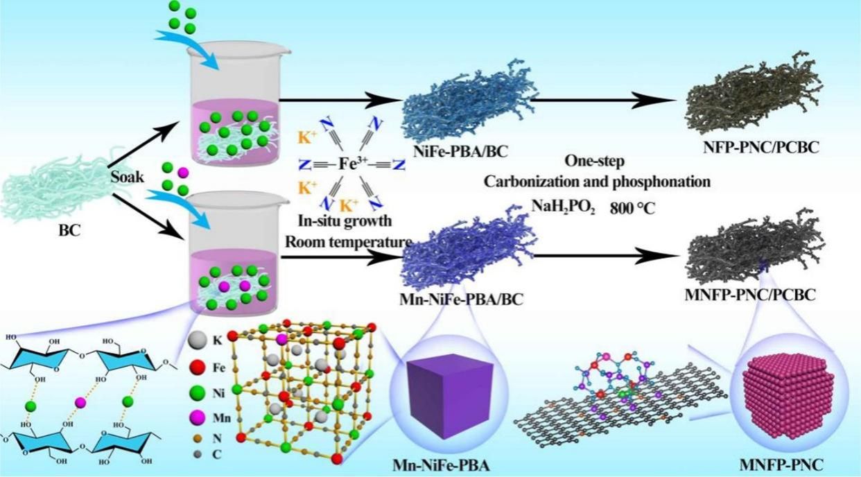 并且,本研究團隊以細菌纖維素為基材,以Mn摻雜NiFe-PBA為前驅(qū)體,通過一步碳化-磷酸化方法制備了嵌入P、N共摻雜碳基底并直接在P摻雜CBC(MNFP-PNC/PCBC) 表面生長的PBA衍生的Mn摻雜磷酸鎳鐵,用于電催化葡萄糖轉(zhuǎn)化與制氫耦,MNFP-PNC/PCBC的精確電子調(diào)制和結(jié)構(gòu)設(shè)計增強了催化劑的內(nèi)稟活性和暴露活性位點的數(shù)量,并通過錨定納米活性材料提供了優(yōu)異的導(dǎo)電性和穩(wěn)定性。在葡萄糖存在的情況下,只需1.55 V的低電位即可達到50 mA cm?2的電流密度。有趣的是,這種耦合系統(tǒng)在陰極有效地生成了氫氣,而陽極葡萄糖轉(zhuǎn)化率的增加導(dǎo)致葡萄糖轉(zhuǎn)化率達到97%,甲酸鹽的產(chǎn)率為79.5%,法拉第效率為86.1%。這項工作為開發(fā)高催化活性生物質(zhì)電催化轉(zhuǎn)化耦合制氫電催化劑開辟了新的前景,通過結(jié)構(gòu)工程和電子調(diào)制具有廣泛的應(yīng)用可能性。相關(guān)研究成果以“Precise electronically modulated Mn doped nickel iron phosphate with P, N codoped carbon decorated P-doped carbonized bacterial cellulose for efficient electrocatalytic glucose conversion coupled with H2 generation”為題發(fā)表在國際期刊Separation and Purification Technology(文章鏈接:https://doi.org/10.1016/j.seppur.2024.127178)。