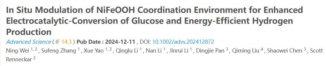 本團隊以NiFe基金屬有機框架(MOF)為前驅(qū)體,通過離子交換和磷酸化制備W摻雜磷化鎳鐵(W-NiFeP)納米片陣列,其對析氫反應(yīng)(HER)表現(xiàn)出高電催化活性,具有僅-179 mV的過電位,在堿性介質(zhì)中可實現(xiàn)100 mA cm?2的電流密度,W-NiFeP的電化學(xué)活化促進了磷酸基團的原位形成,產(chǎn)生W,P-NiFeOOH。這項工作的結(jié)果突出了開發(fā)用于生物質(zhì)電催化轉(zhuǎn)化的有效電催化劑在構(gòu)建用于綠色氫氣生產(chǎn)的高效電解槽中的重要性。相關(guān)研究成果以“In Situ Modulation of NiFeOOH Coordination Environment for Enhanced Electrocatalytic-Conversion of Glucose and Energy-Efficient Hydrogen Production”為題發(fā)表在國際期刊Advanced Science(文章鏈接:https://doi.org/10.1002/advs.202412872)。