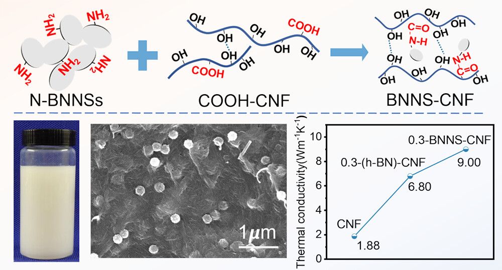 隨著電子器件不斷向高功率和集成化方向發(fā)展,導(dǎo)致對具有高導(dǎo)熱性和電絕緣性的可再生聚合物復(fù)合材料的需求日益增加,以解決電子器件過熱的問題?;诖耍緢F隊對六方氮化硼進行球磨和氨基改性,然后使用羧基化納米纖維素(COOH-CNF)來分散氮化硼納米片(BNNSs)。在酰胺鍵的幫助下,BNNSs在納米纖維素(CNF)基體中均勻分散;這減少了BNNSs之間的聚集和空隙的存在,促進了有效熱通道的構(gòu)建。所得復(fù)合漿料分散穩(wěn)定,可以過濾成膜;當(dāng)BNNSs的負載量為30%時,綜合性能最佳,導(dǎo)熱系數(shù)(TC)為9.00 W·m?1·K?1(CNF為1.88 W·m?1·K?1)。此外,體積電阻率達到9.38×1013 Ω·cm(CNF為2.53×1013 Ω·cm),電強度為22.67 kV·mm(CNF為17.04 kV·mm)。結(jié)果表明,BNNS-CNF復(fù)合薄膜具有高導(dǎo)熱性和優(yōu)異的絕緣性能,因此在電子設(shè)備熱管理方面具有廣闊的應(yīng)用前景。相關(guān)研究成果以“Highly Exfoliated Boron Nitride Nanosheets Via Carboxyl Nanocellulose for Thermally Conductive Nanocomposite Films”為題發(fā)表在國際期刊ACS Applied Nano Materials(文章鏈接:https://doi.org/10.1021/acsanm.3c05310)