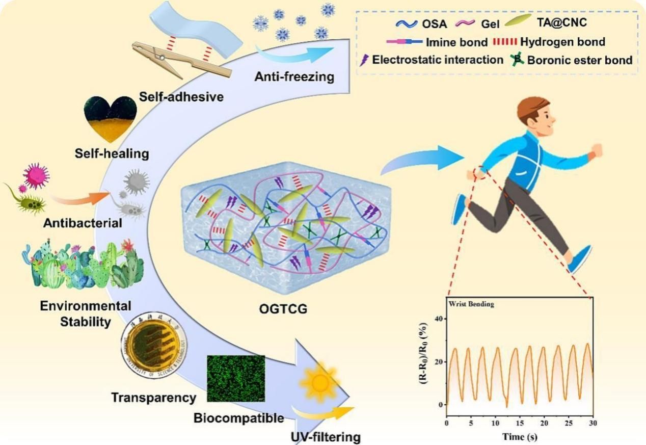 本團隊受貽貝和壁虎啟發(fā)的仿生學(xué),通過水/甘油系統(tǒng)和硼砂的簡單一步法設(shè)計和構(gòu)建了具有自粘、自修復(fù)、透明、紫外線過濾、抗霜凍、環(huán)境穩(wěn)定、抗菌和生物相容性特性的全生物質(zhì)基水凝膠(OGTCG)使用協(xié)同動態(tài)共價和非共價化學(xué)方法在沒有任何交聯(lián)劑的情況下添加。OGTCG水凝膠的透明度達到 81.06 %,而添加的單寧酸包覆的纖維素納米晶(TA@CNC)誘導(dǎo)了紫外線阻擋效果。OGTCG水凝膠表現(xiàn)出高韌性(218.67 kPa)和模量 (100.32 kPa),TA@CNC 增強。OGTCG水凝膠表現(xiàn)出良好的自愈能力,6小時后效率超過 90%。在二元溶劑體系中,OGTCG水凝膠具有環(huán)境穩(wěn)定性,如密度泛函理論(DFT)所示,大大拓寬了其應(yīng)用范圍。此外,它的導(dǎo)電率為2.3 mS cm?1靈敏度為3.97。因此,OGTCG水凝膠憑借其快速響應(yīng)和實時監(jiān)測能力,在監(jiān)測人類健康方面顯示出巨大的應(yīng)用潛力。相關(guān)研究成果以“Tannic acid-coated cellulose nanocrystal-reinforced transparent multifunctional hydrogels with UV-filtering for wearable flexible sensors”為題發(fā)表在國際期刊Carbohydrate Polymers(文章鏈接:https://doi.org/10.1016/j.carbpol.2023.121385)
