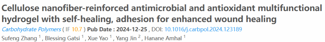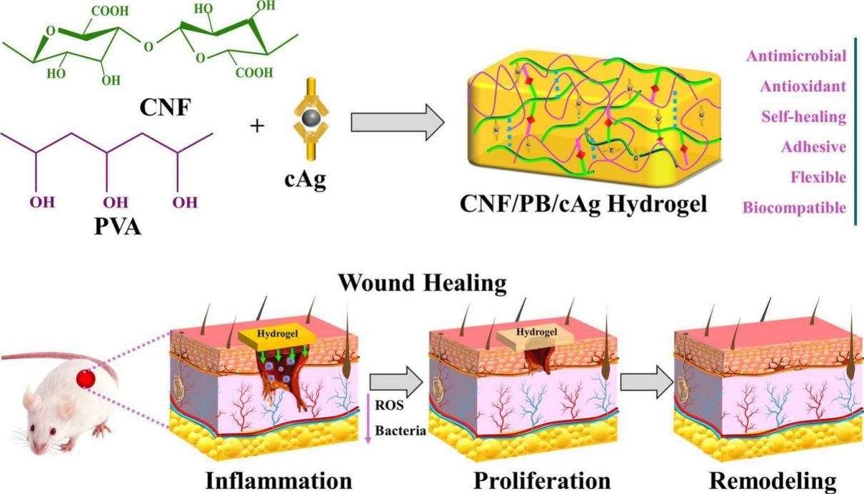 目前用于傷口愈合的傳統(tǒng)傷口敷料通常具有生物活性受限且缺乏多功能性的特點,導(dǎo)致治療效果不佳且愈合時間延長。本團隊提出通過一步合成方法,通過交聯(lián)納米纖維素和聚乙烯醇,并利用姜黃素穩(wěn)定銀納米顆粒,形成具有動態(tài)共價鍵和超分子結(jié)構(gòu)的水凝膠網(wǎng)絡(luò)。本設(shè)計采用天然聚合物線性結(jié)構(gòu)納米纖維素作為增強材料,天然抗菌和抗氧化天然多效性化合物姜黃素作為銀納米顆粒的分散劑。特別是,CNF聚合物鏈內(nèi)在組裝成獨特的納米級互穿分層結(jié)構(gòu),允許CNF與相鄰聚合物鏈之間的功能相互作用,有助于改善機械性能、自修復(fù)、柔韌性和粘合性能。有趣的是,CNFs相對反應(yīng)性表面進一步提高了水凝膠的多功能性能。這也可以歸因于相互滲透的納米纖維素和PVA聚合物鏈之間的物理相互作用(氫鍵和鏈纏結(jié))和動態(tài)共價化學(xué)(硼酸鹽酯鍵)的多個互連網(wǎng)絡(luò)的聯(lián)合相互作用。值得注意的是,姜黃素改性納米銀顆粒(cAg)的引入預(yù)計將通過增強水凝膠的生物活性在保持全部療效的同時,對傷口修復(fù)發(fā)揮雙重協(xié)同治療關(guān)鍵作用。這些多方面的特征以及所提出的CNF/PB/cAg水凝膠的簡單且可擴展的制備方法表明其在臨床應(yīng)用中具有巨大的應(yīng)用潛力。相關(guān)研究成果以“Cellulose Nanofiber-reinforced Antimicrobial and Antioxidant Multifunctional Hydrogel with Self-healing, Adhesion for Enhanced Wound Healing”為題發(fā)表在國際期刊Carbohydrate Polymers(文章鏈接:https://doi.org/10.1016/j.carbpol.2024.123189)