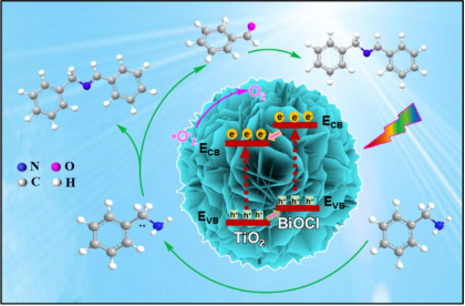團隊開發(fā)出狀BiOX/TiO2(X=Cl, Br, I)異質(zhì)結(jié)光催化劑,在無溶劑條件下實現(xiàn)芐胺高效氧化合成N-芐叉芐胺,突破了傳統(tǒng)溶劑型催化體系的效率瓶頸。在可見光照射下,BiOCl/TiO2異質(zhì)結(jié)催化劑展現(xiàn)高達6316 μmol·g-1·h-1的N-芐叉芐胺生成速率,選擇性達99%,芐胺轉(zhuǎn)化率為87%。這一性能不僅遠超無溶劑體系此前報道的最高形成速率(<5100 μmol·g-1·h-1),甚至可與傳統(tǒng)溶劑型催化體系媲美。該工作以“Boosting the solvent-free photocatalytic oxidation of benzylamine to N-benzylenebutylamine over BiOX/TiO2 heterojunction nanoflowers”為題發(fā)表于《Separation and Purification Technology》。21級碩士張婷為第一作者,王偉濤副教授和劉昭鐵教授為通訊作者。