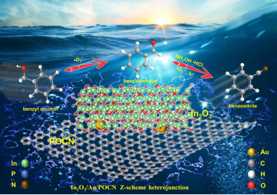 團隊開發(fā)出In2O3/Au/POCN三元Z型異質(zhì)結(jié)光催化劑,首次實現(xiàn)無溶劑條件下芐醇有氧光催化氨氧化制備苯甲腈。通過構(gòu)建In2O3與磷氧共摻雜氮化碳(POCN)的Z型異質(zhì)結(jié),并引入金納米顆粒作為電子橋,顯著提升了光生載流子的分離效率。研究首次揭示了無溶劑反應中生成水的負面影響:水會占據(jù)催化劑活性位點并促進腈水解為酰胺,而添加4?分子篩可通過除水使收率提升31.7%,這一發(fā)現(xiàn)為無溶劑催化體系的優(yōu)化提供了關鍵策略。該工作以“Solvent-free direct aerobic photocatalytic ammoxidation of benzyl alcohol to benzonitrile on In2O3/Au/POCN”為題發(fā)表在《Journal of Catalysis》。20級博士姜旭祿為第一作者,王偉濤副教授和劉昭鐵教授為通訊作者。