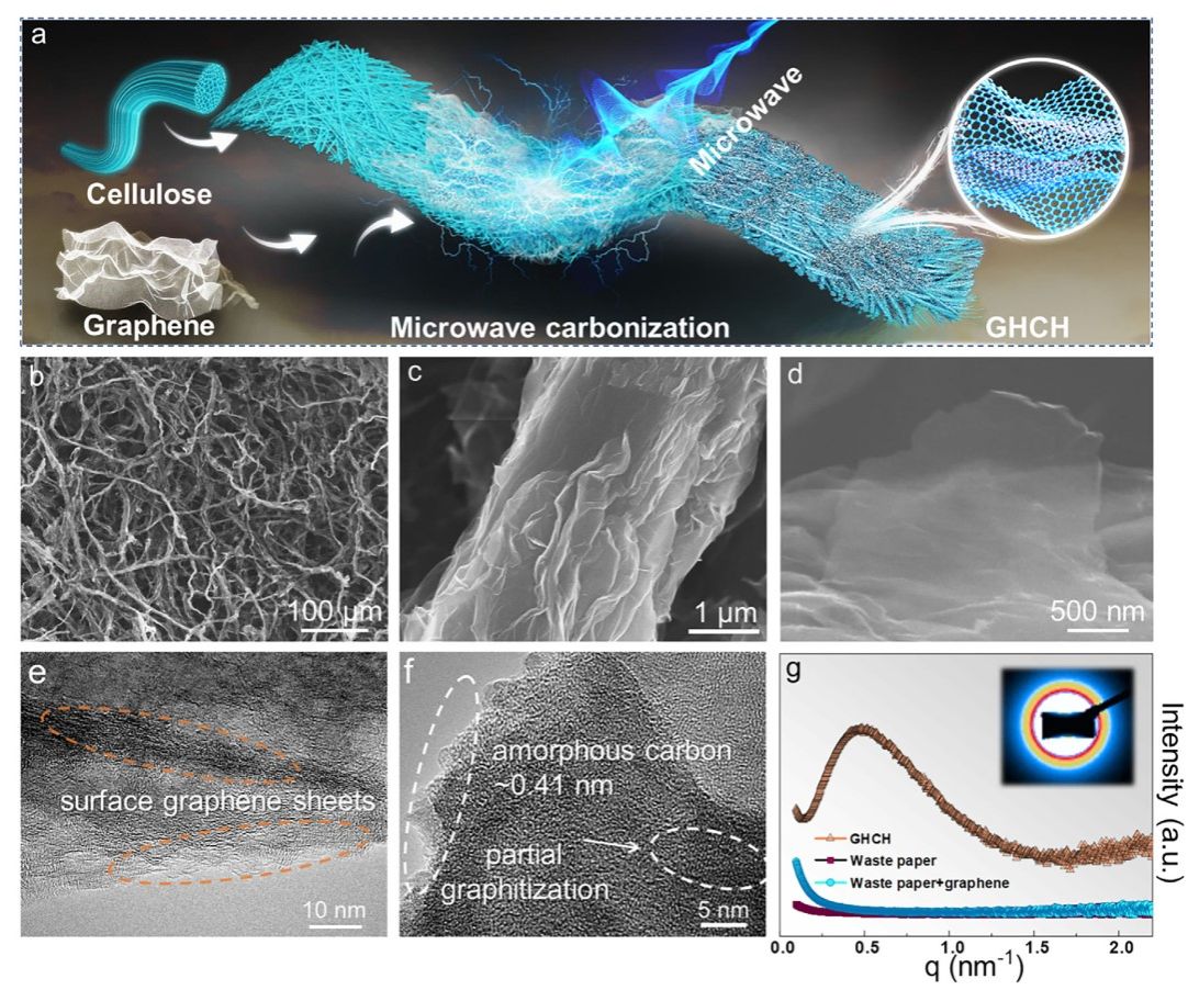 傳統(tǒng)碳化法制備碳材料面臨能耗高、效率低的瓶頸。本研究采用微波碳化技術,利用石墨烯微反應器,在短短 10 秒內快速碳化廢紙,制備出一種由石墨烯與硬碳構成的異質結構碳質電極。通過結合實驗證據與有限元模擬,證實了一種新穎的微波碳化機理:石墨烯吸收微波產生高頻等離子體電磁波,該電磁波“催化”樣品快速吸收微波,導致樣品內部發(fā)生電擊穿從而引發(fā)初步碳化。利用這種超快碳化技術制備的碳質材料作為鉀離子電池負極,展現出高可逆容量和優(yōu)異的循環(huán)穩(wěn)定性??傊⒉ㄌ蓟癁楹铣筛咝阅芴蓟姌O提供了一條可持續(xù)且高效的途徑。https://doi.org/10.1002/adfm.202508032