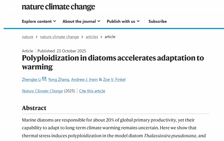 近日,我校食品科學(xué)與工程學(xué)院(生物與醫(yī)藥學(xué)院)李政科副教授與福建師范大學(xué)的張勇副教授、加拿大達(dá)爾豪斯大學(xué)的Zoe V. Finkel教授和Andrew J. Irwin教授合作,在國(guó)際頂級(jí)期刊《自然·氣候變化》(Nature Climate Change)發(fā)表了題為“硅藻多倍體化加速其對(duì)氣候變暖的適應(yīng)”的研究論文。我校李政科副教授為第一作者和通訊作者,陜西科技大學(xué)為第一單位。該研究成果得到了國(guó)家自然科學(xué)基金面上項(xiàng)目和青年基金(32371681,32001180)、加拿大自然科學(xué)暨工程研究委員會(huì)基金、加拿大研究主席項(xiàng)目、美國(guó)CBIOMES等項(xiàng)目的資助。該研究證實(shí),熱脅迫具有誘導(dǎo)海洋硅藻假微型海鏈藻(Thalassiosira pseudonana)發(fā)生多倍體化(即基因組加倍)的潛力,且多倍體藻株在高溫環(huán)境下表現(xiàn)出比二倍體祖先更快的適應(yīng)速度。