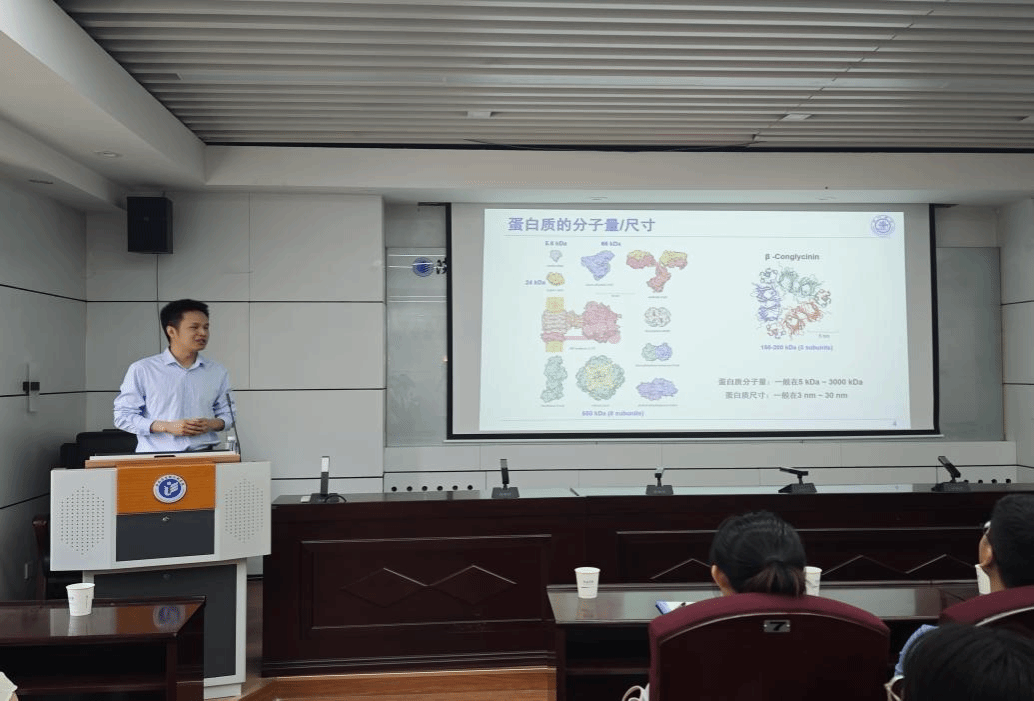 操義平教授以植物源食品蛋白質(zhì)的纖維化研究為例,從蛋白質(zhì)結(jié)構(gòu)解析與功能應(yīng)用兩方面為參會師生進行了詳細介紹。他講解了大豆11S蛋白、花生蛋白、棉籽蛋白等植物蛋白的纖維化機制,指出通過調(diào)控溫度與時間可實現(xiàn)纖維結(jié)構(gòu)的定向設(shè)計。基于中國血紅蛋白年儲量超157萬噸、全球超594萬噸的數(shù)據(jù),他強調(diào)開發(fā)新型蛋白資源對滿足人口蛋白需求的戰(zhàn)略意義,并在植物蛋白資源高效利用方面提出指導(dǎo)性的建議。