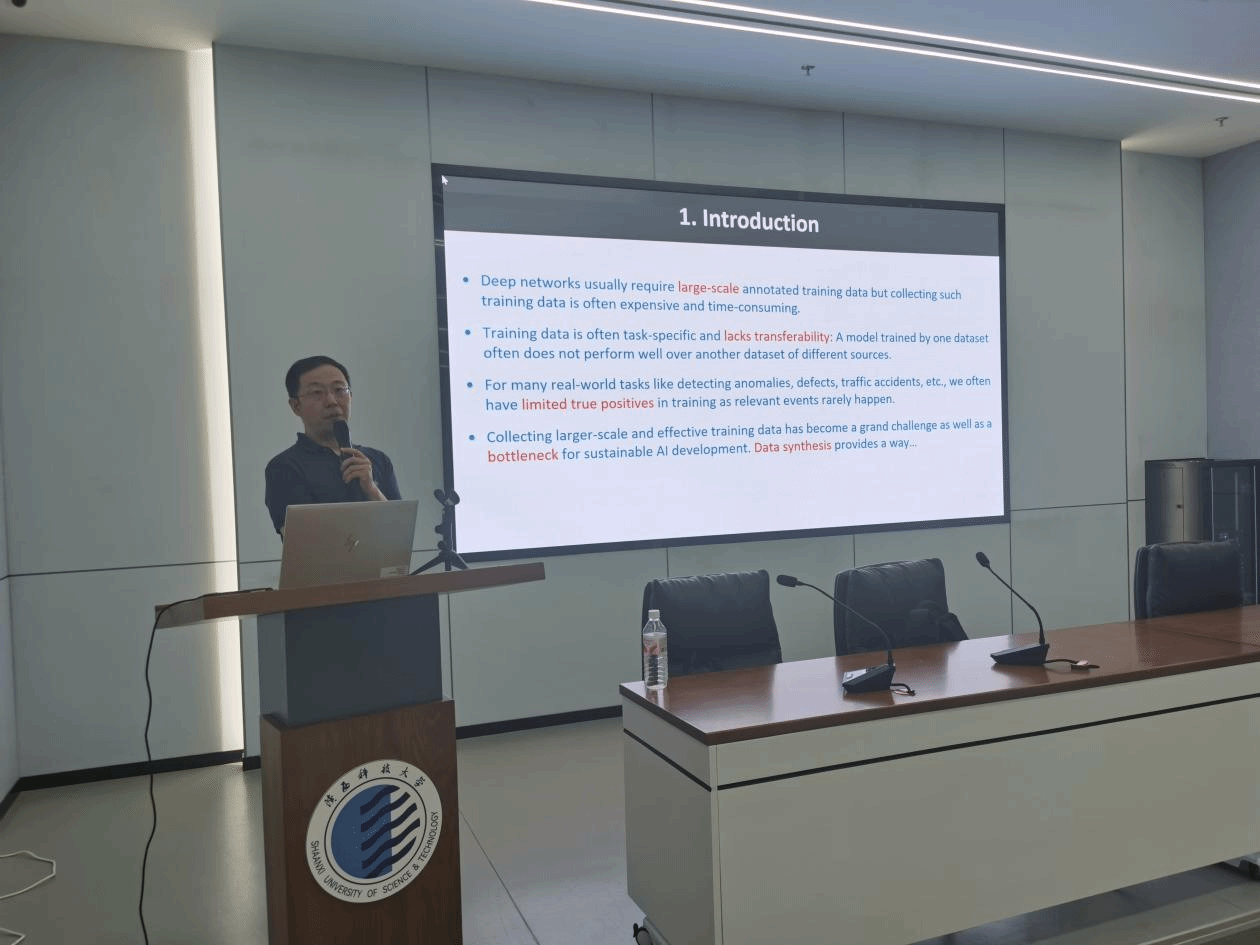 6月17日上午,受電氣與控制工程學(xué)院邀請,南洋理工大學(xué)呂士健博士做客陜西科技大學(xué)“前沿科學(xué)報告”。作了題為“Sustainable AI via Image Generation and Cross-Domain Transfer”的學(xué)術(shù)報告。會議由電控學(xué)院副院長周強主持,相關(guān)師生80余人參加了此次報告會。