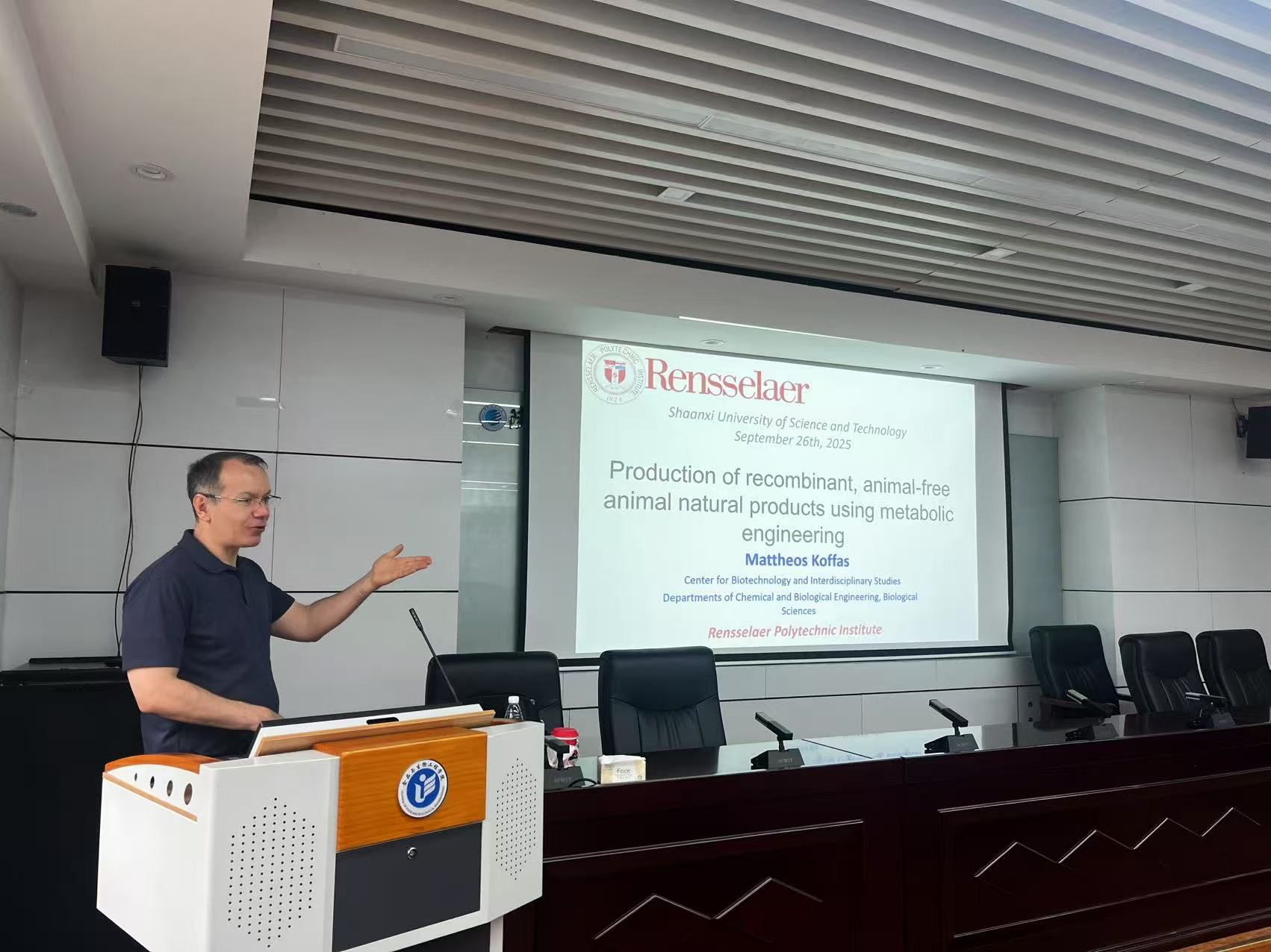 9月26日,應(yīng)我校國際合作與交流處、食品科學(xué)與工程學(xué)院(生物與醫(yī)藥學(xué)院)邀請,美國倫斯勒理工學(xué)院Mattheos Koffas教授做客我?!皣H教育論壇”,來校交流訪問并做了題為“Production of recombinant, animal-free animal natural products using metabolic engineering”的學(xué)術(shù)報告。學(xué)院相關(guān)專業(yè)師生參加了本次報告會。