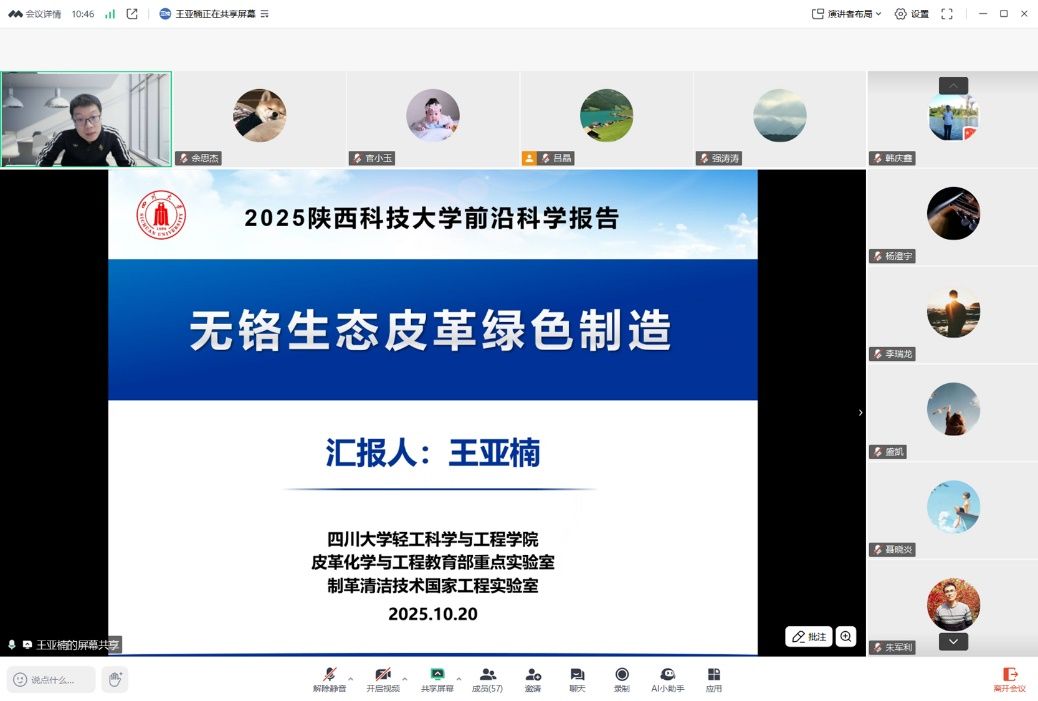10月21日上午,應(yīng)科技處、前沿院及輕工科學(xué)與工程學(xué)院邀請,中國林業(yè)科學(xué)研究院王奎研究員、四川大學(xué)王亞楠教授做客我?!扒把乜茖W(xué)報告”,并分別做題為“生物基呋喃化學(xué)品低碳高效轉(zhuǎn)化”、“無鉻生態(tài)皮革綠色制造”的線上學(xué)術(shù)報告。輕工學(xué)院相關(guān)專業(yè)教師、研究生參加報告會。