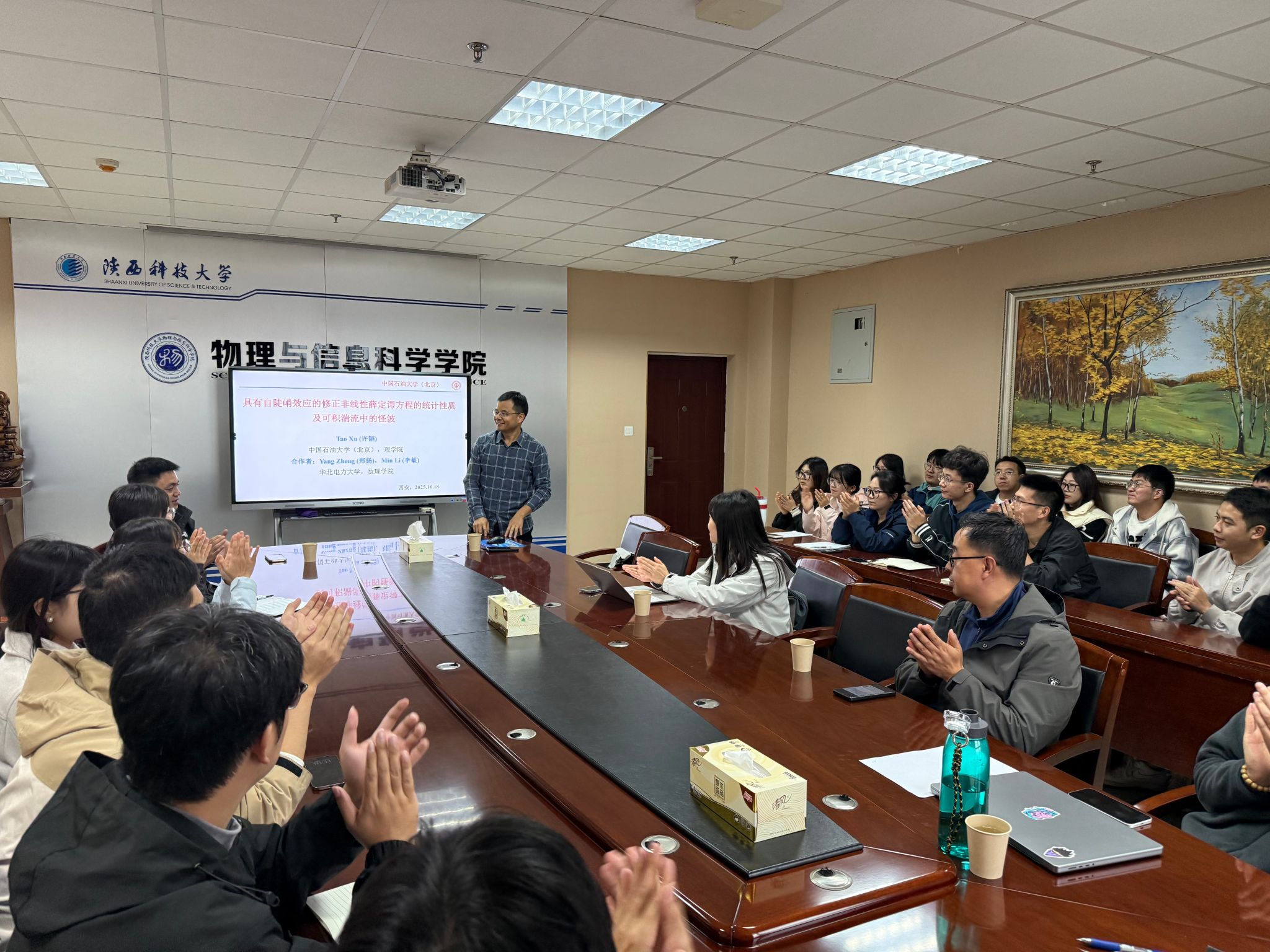 10月17日下午,應物理學院、研究生院邀請,中國石油大學許韜教授做客我?!拔囱雽熣搲?,在理科樓441做題為“具有自陡峭效應的修正非線性薛定諤方程的統(tǒng)計性質及可積湍流中的怪波”的學術報告。報告會由物理學院副院長張曉斐主持,量子信息系相關專業(yè)教師、研究生參加報告會。