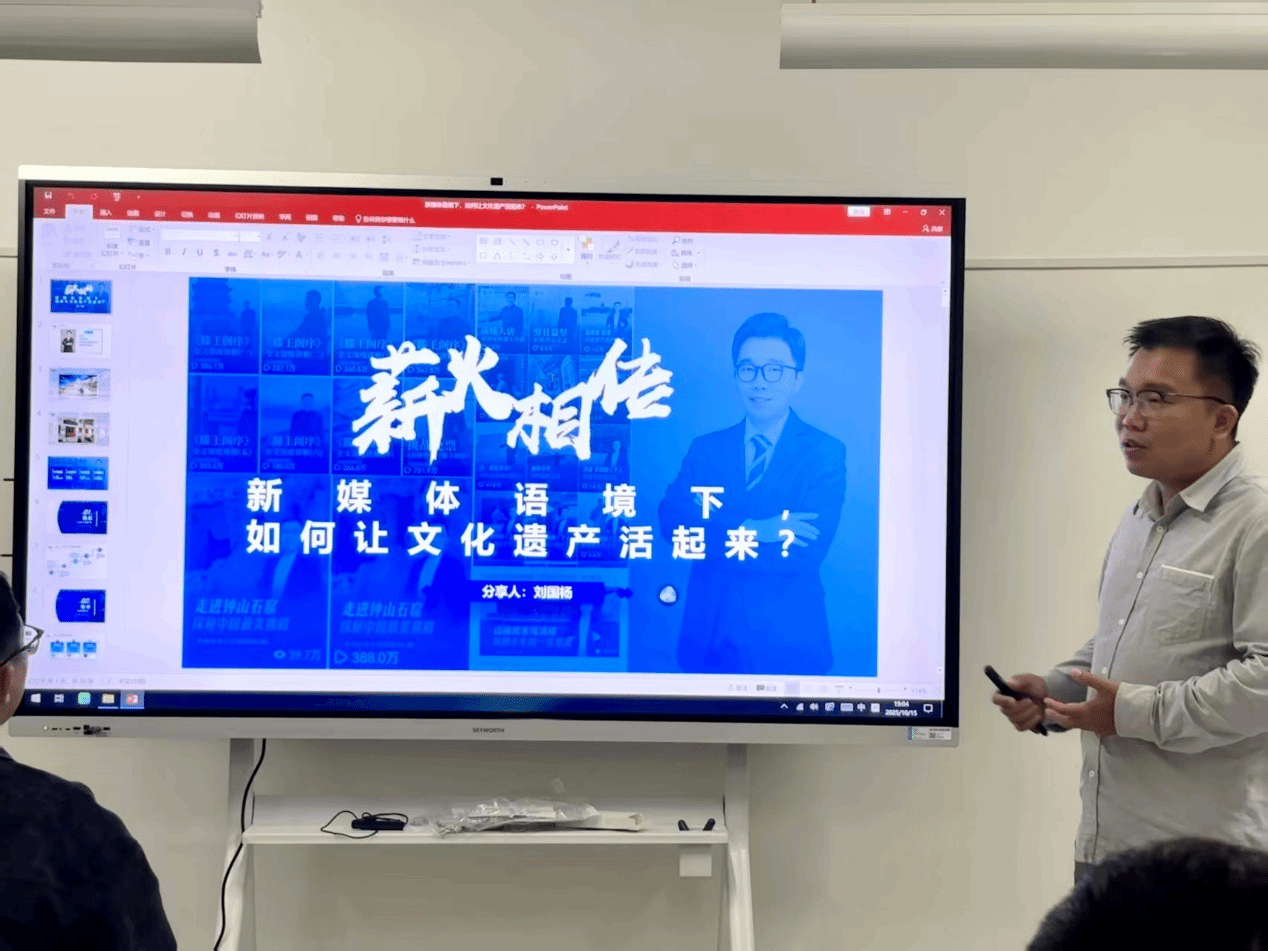 報(bào)告會(huì)上,劉國楊教授結(jié)合自身在文化傳播領(lǐng)域和自媒體領(lǐng)域的實(shí)踐和積累,從“扎根田野”“時(shí)空對(duì)話”“破壁表達(dá)”“跨界共創(chuàng)”四個(gè)維度出發(fā),對(duì)如何將文化遺產(chǎn)與新媒體相結(jié)合,推動(dòng)文化遺產(chǎn)活化做了詳細(xì)講述,表示一定要對(duì)文化遺產(chǎn)懷有敬畏之心,善于挖掘文化遺產(chǎn)背后的故事,肩負(fù)起傳播優(yōu)秀傳統(tǒng)文化的時(shí)代使命。
